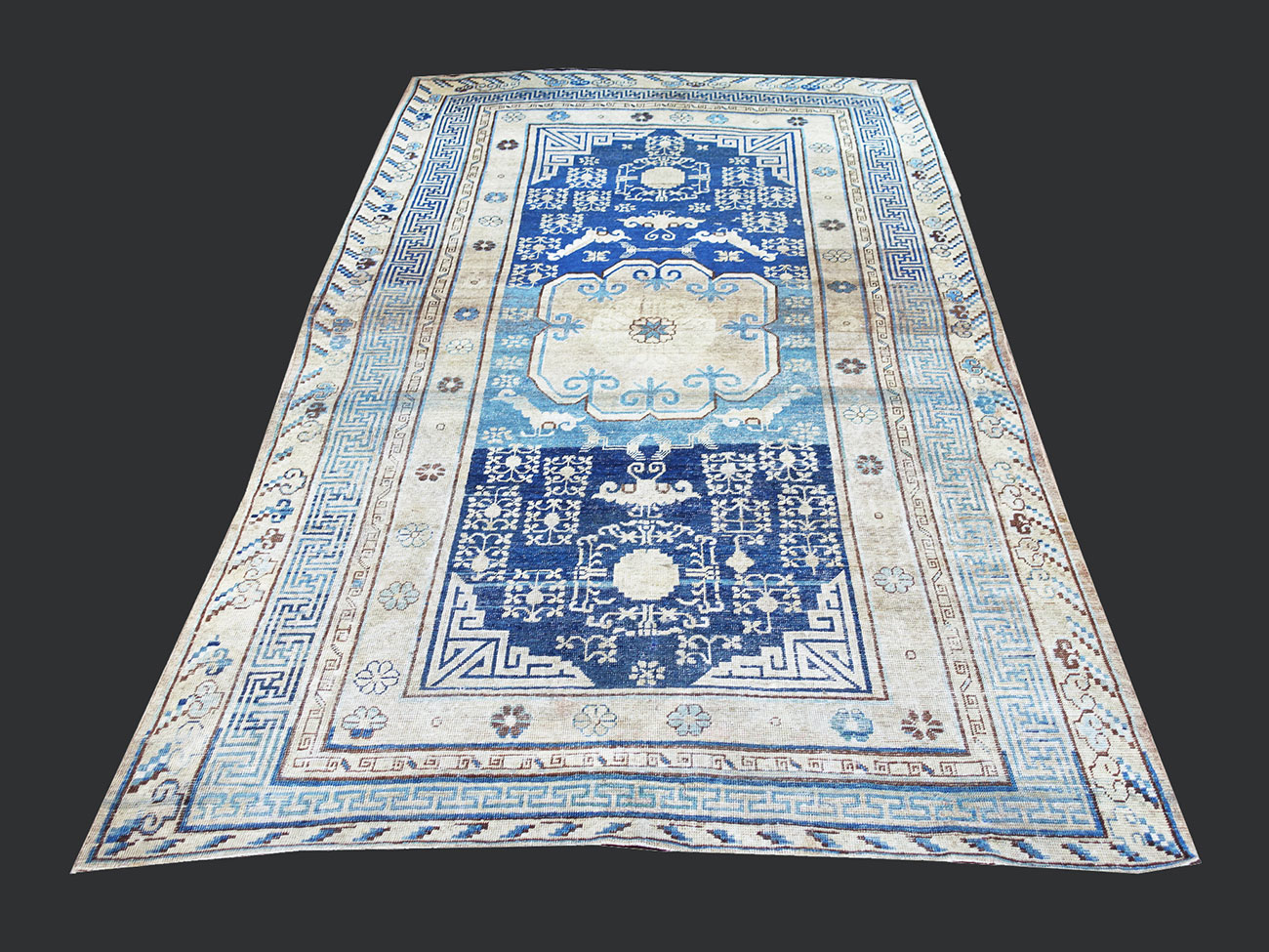 East Turkestan 19th ct. A Khotan long rug with an attractive color scheme, based on tones of beige blue and sky blue.