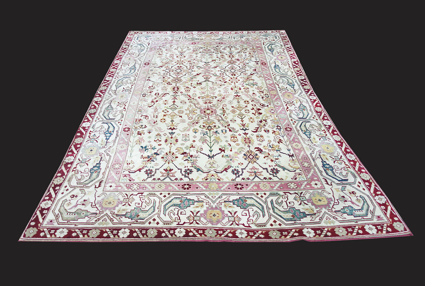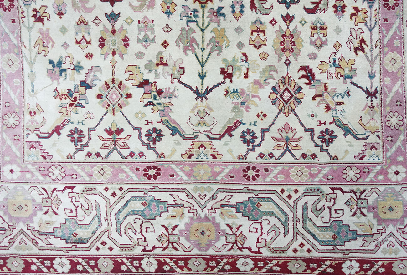 An Agra carpet with a light colored, all over patterned white background and a white background border frame with arabescated ornaments and stylized "Boteh" motifs. Attractive piece with well balanced color scheme.
