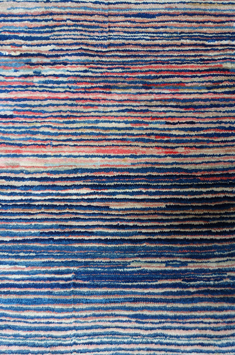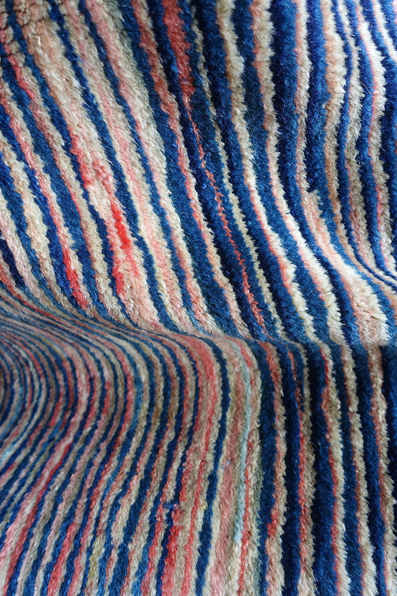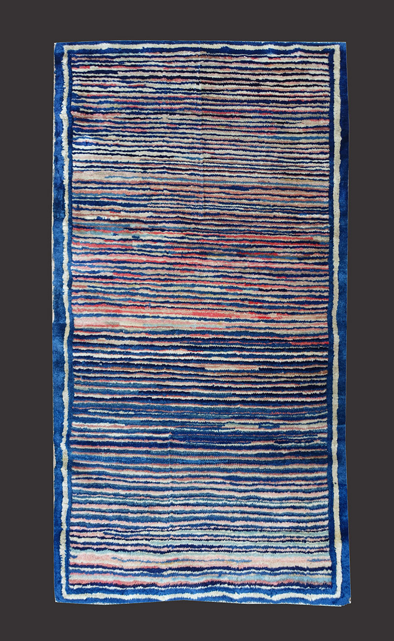 Northwest China Late 19th ct. A small Kansu rug with a finely striped inner field in various shades of blu and some red accents. The small rug has a surprisingly modern and contemporary expression.