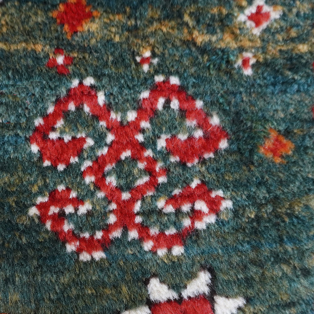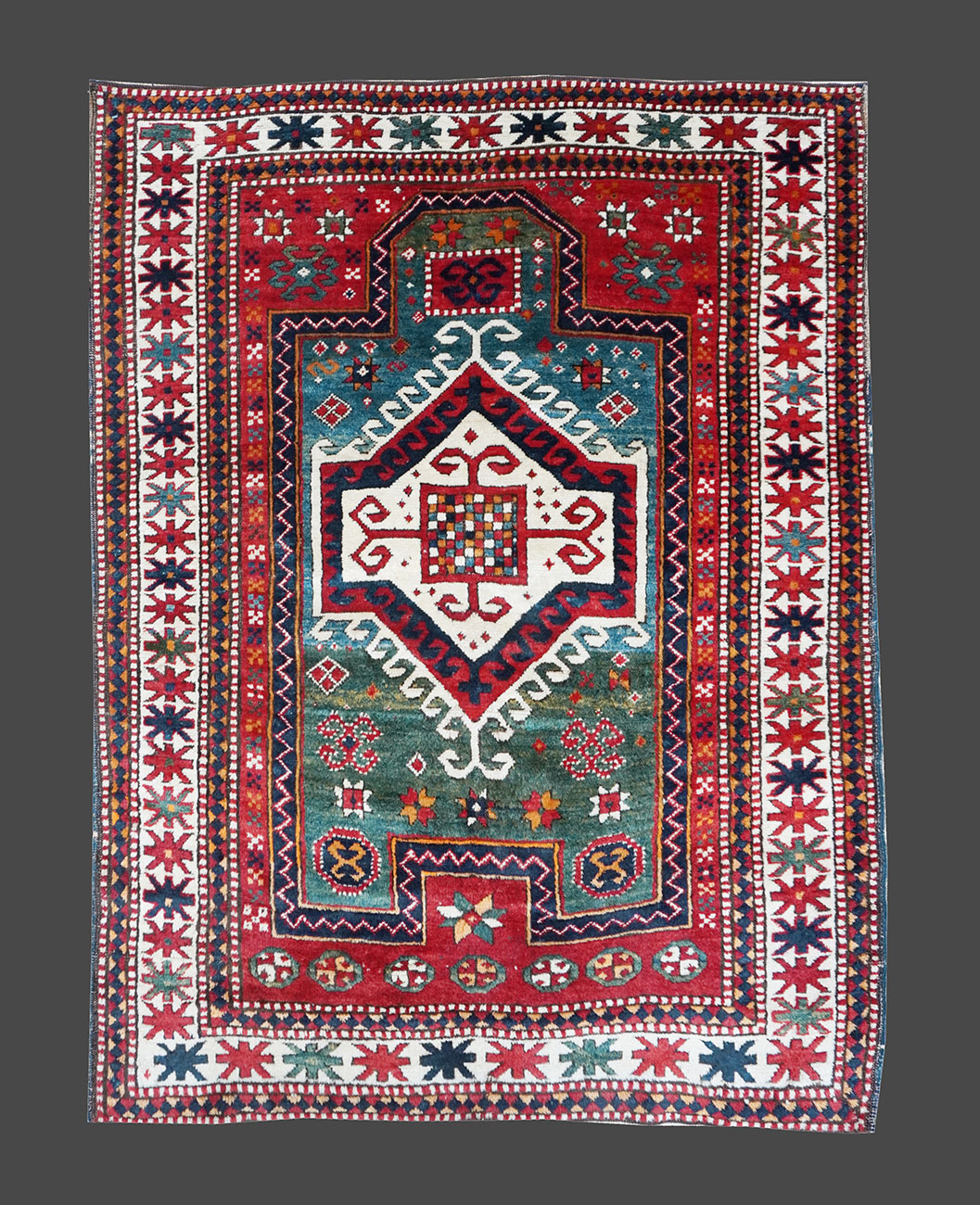 Tappeto Fakhralo da preghiera con impostazione classica. Il tappeto dispone di una grafica avvincente e colori saturi e vivaci. Particolarmente attraente è il disegno a “scacchiera multicolore” del motivo centrale.