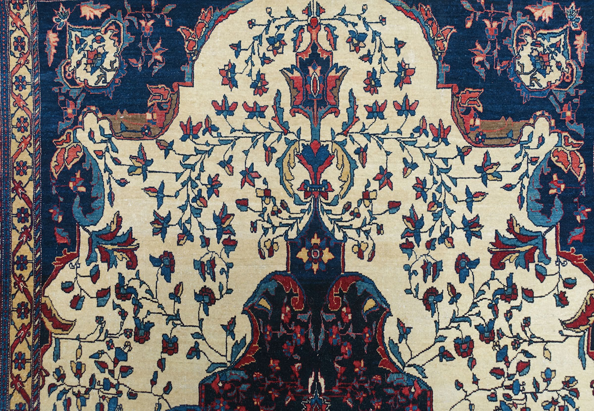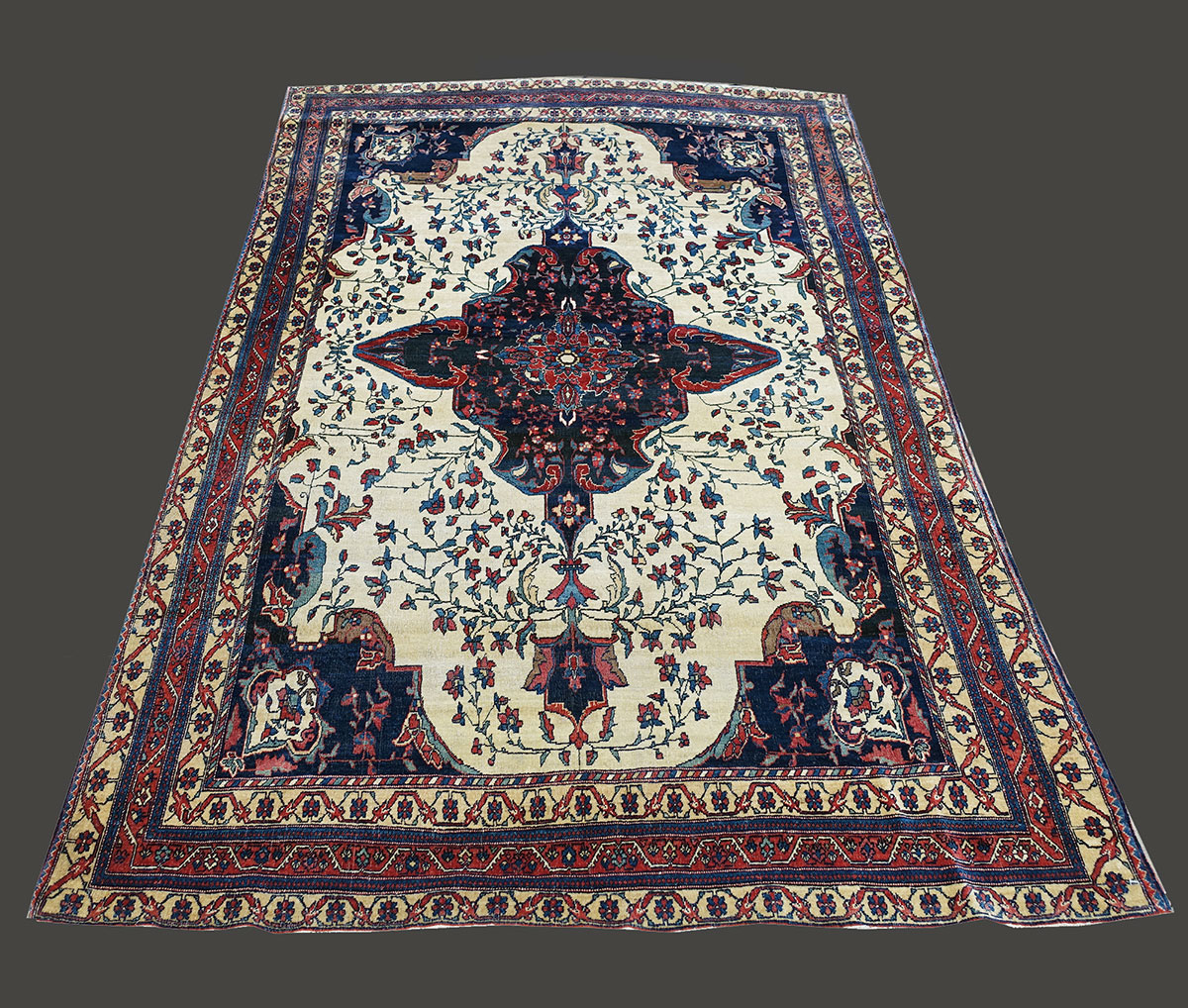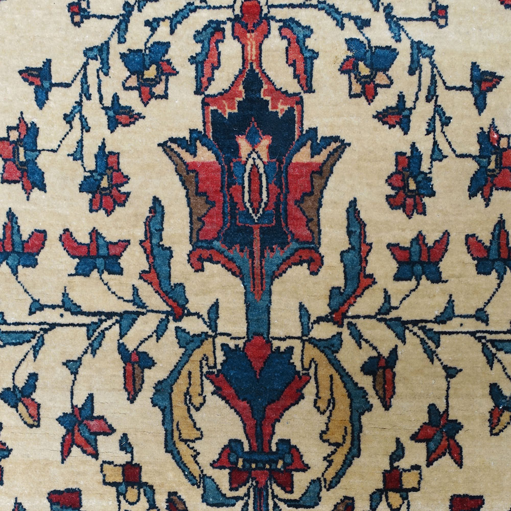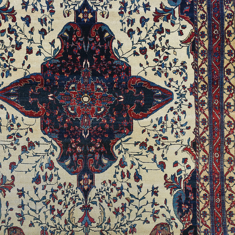 L'annodatura fine con delle lane di qualitĂ "kork" mettono in ottimo risalto la perfezione dell'ornamentazione a base di gracili motivi floreali che circondano un grande medaglione centrale a fondo blu inchiostro.