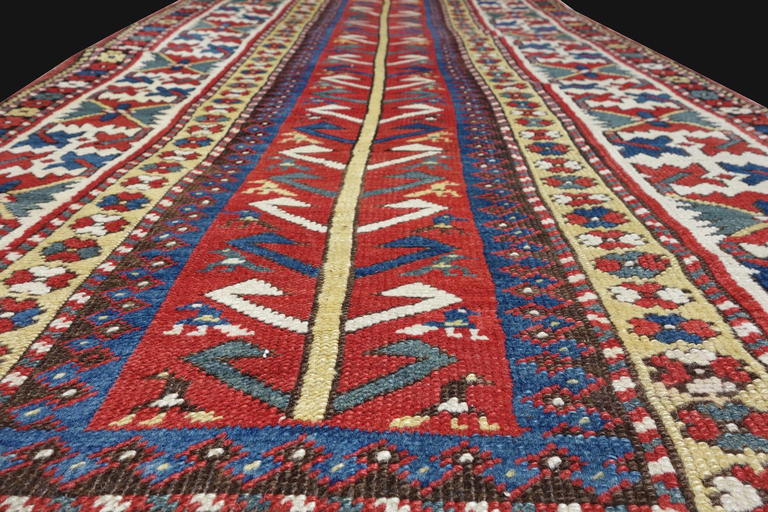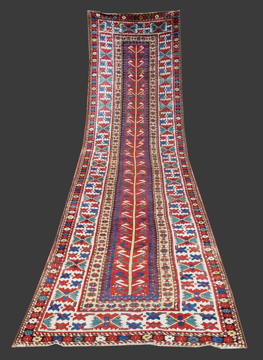 Tappeto Gendje che si presenta in forma di una corsia allungata. Il dominante motivo che ricopre interamente il campo interno è la raffigurazione geometrizzata di un "albero di vita". La semplicità e ed il alto grado di astrazione rendono molto "moderno" questo manufatto antico.