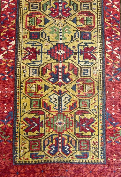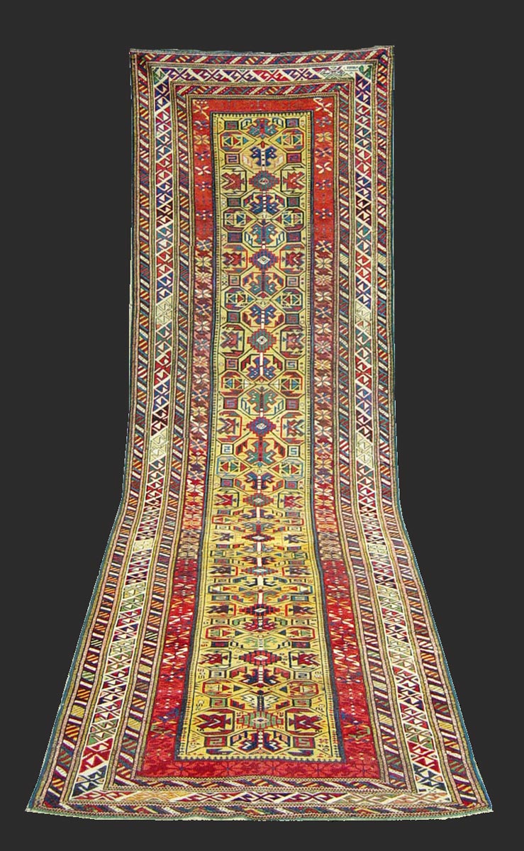 Passatoia Kuba Shirvan a fondo giallo con un disegno ad albero di vita, altamente stilizzato. Il tappeto è di annodatura fine con colori molto armoniosi.