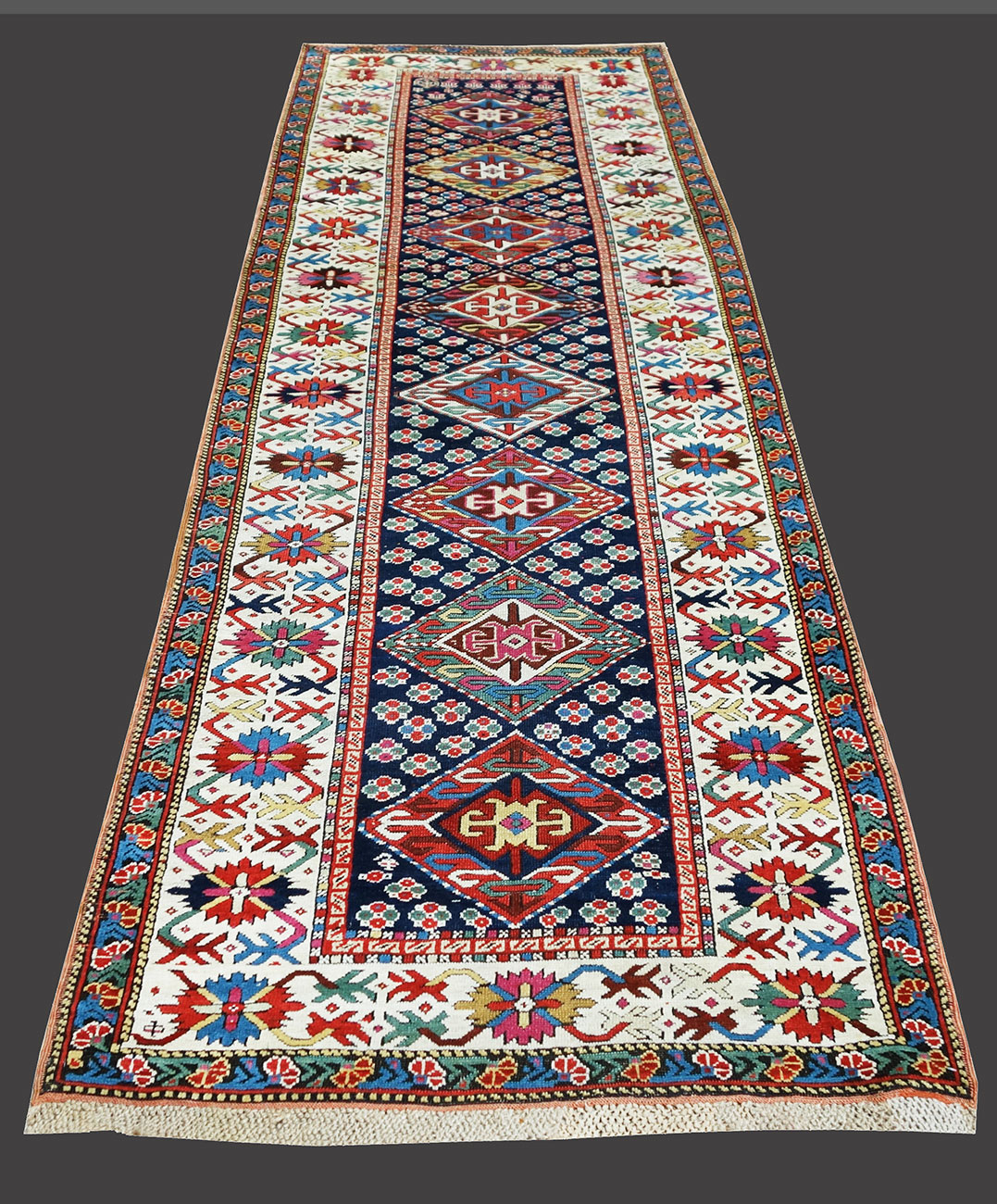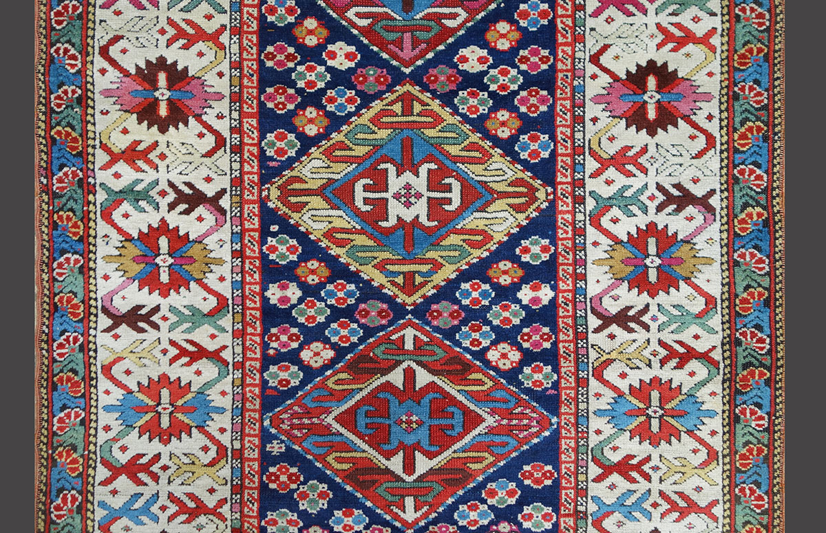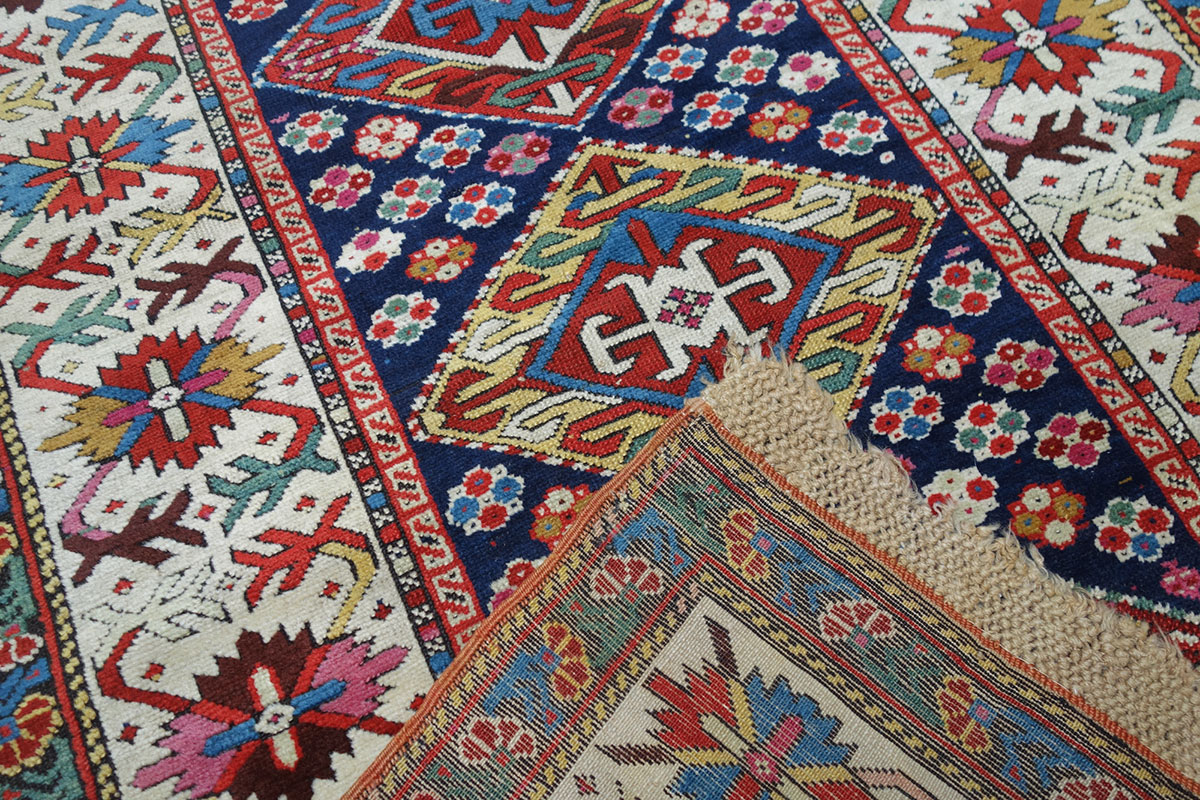 Questo esemplare può vantarsi di una colorazione particolarmente ricca e luminosa. Il gioco spettacolare dei colori è abbinato ad una grafica geometrica, basata su rombi che spiccano da un elegante fondo blu. Di grande potenza è l'espressività della bordura, che mette in risalto un antico ornamento caucasico, che in passato spesso venne denominato "bordura a granchi". Tappeto da collezione in ottimo stato di conservazione con le chiusure delle cimose originali.