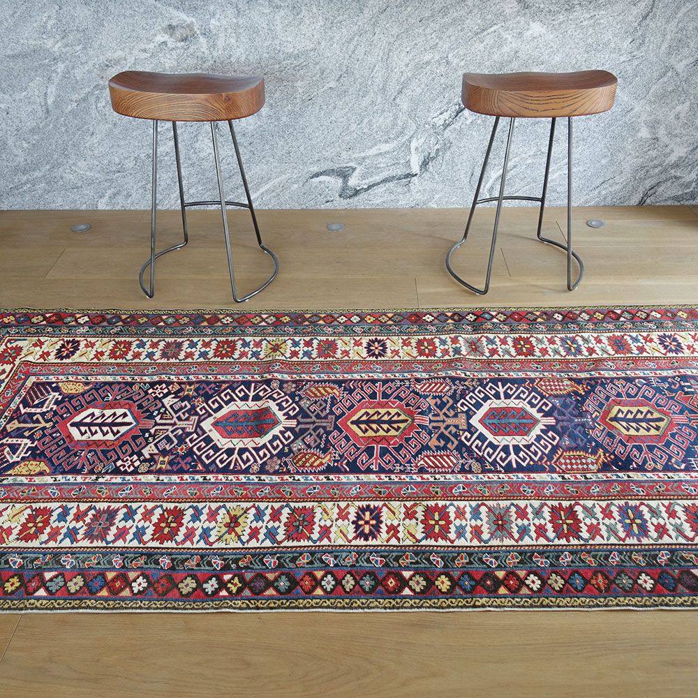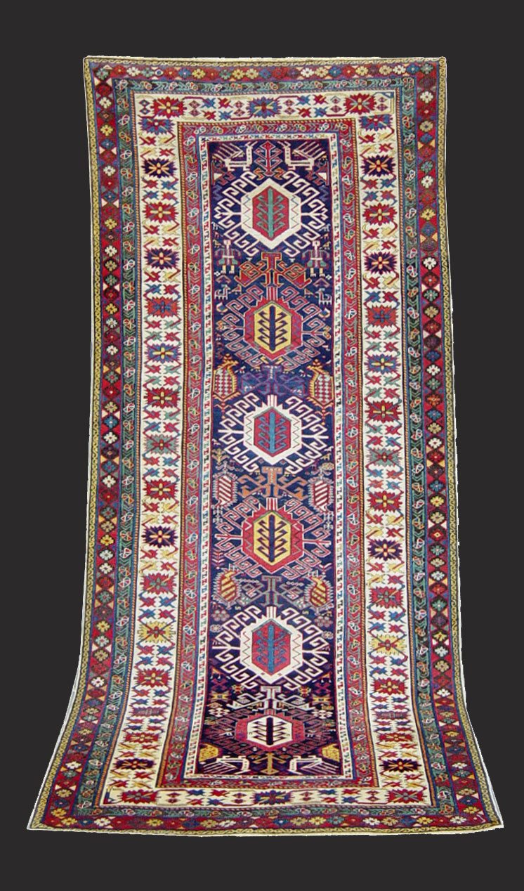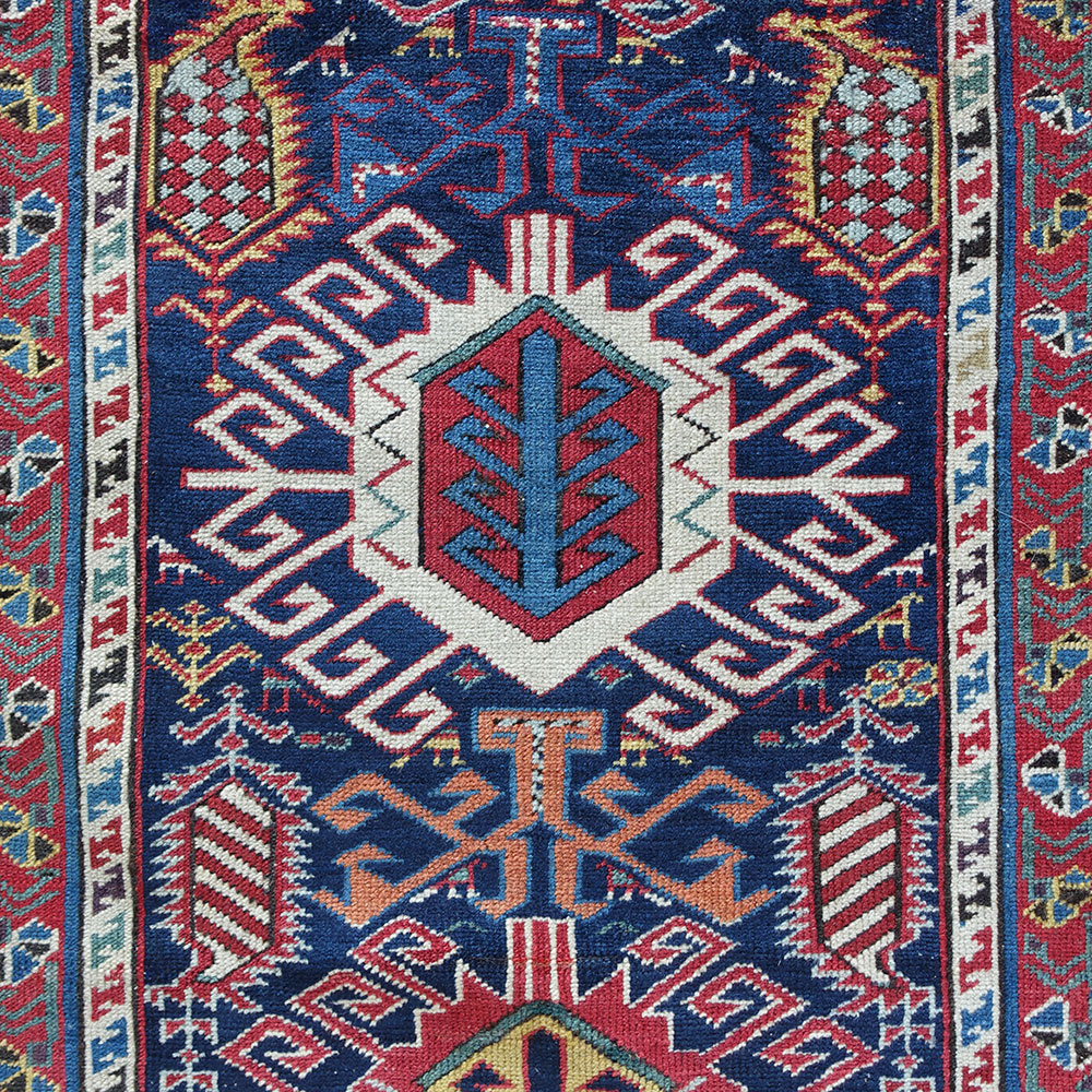 Tappeto Akstafa con un canone di disegni abbastanza inusuale. Ornamenti romboidali contornati da raggi uncinati dominano il fondo blu scuro. Affiancati ai disegni principali si trovano i tipici motivi ad uccelli geometrizzati in alternanza con motivi "boteh" e figure umane stilizzate. Bordo principale a fondo bianco che mette in risalto la colorazione vivace dei motivi "a granchi".