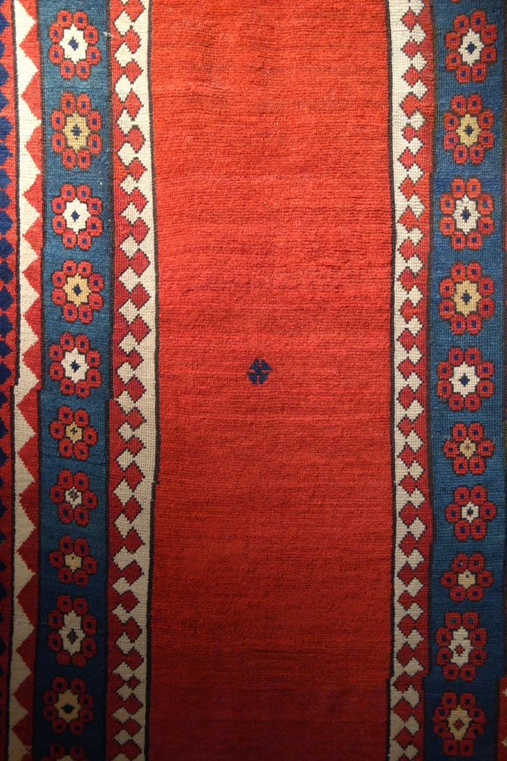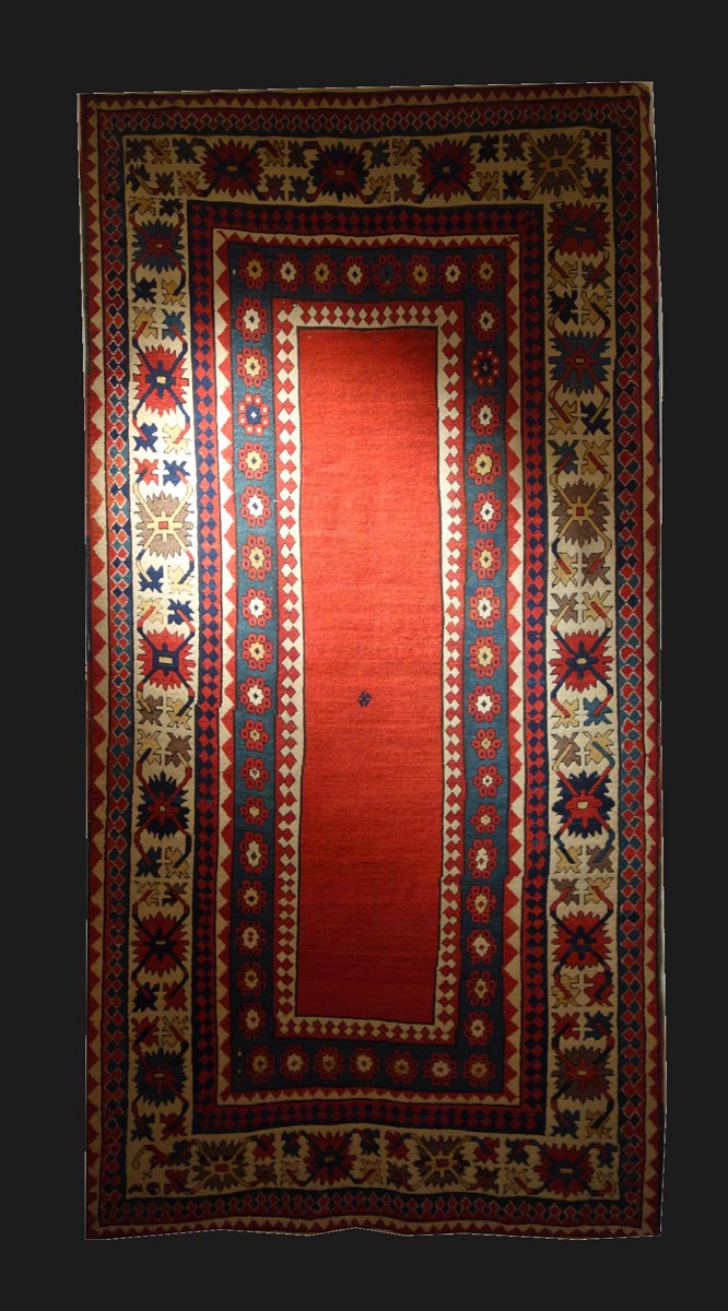 Il tappeto Kazak si presenta con un impianto grafico inusuale, più ricorrente degli tappeti della zona di Talish. Il campo libero "met-haneh" a fondo rosso è circondato da una bordura larga composta da rosette stilizzate ed una cosiddetta bordura "a granchi", composta da ornamentazioni floreali altamente geometrizzate.