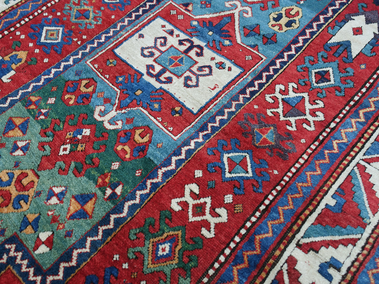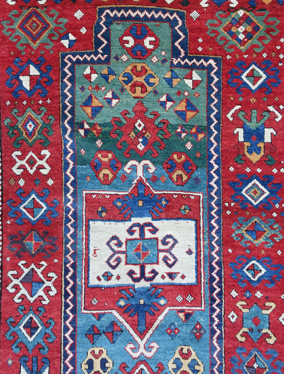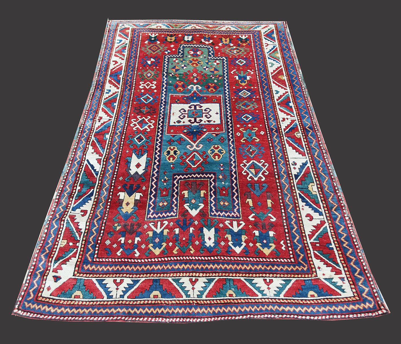 Tappeto Kazak Fachralo da preghiera con una colorazione particolarmente bella, che rispecchia la buona epoca di questo manufatto da collezione. Da notare gli ornamenti "a granchio" che derivano da motivi floreale, di preciso di palmette geometrizzate.