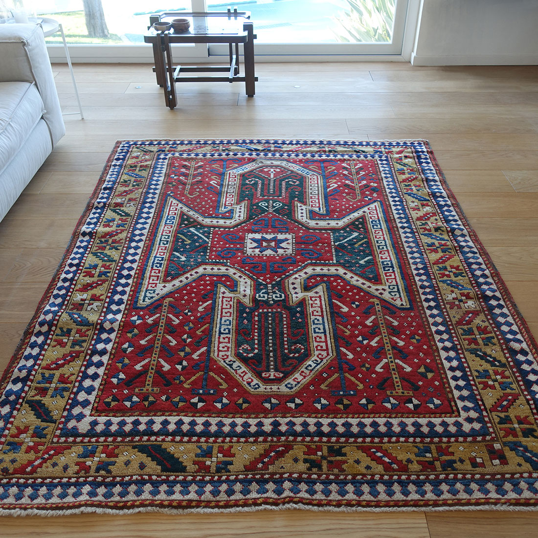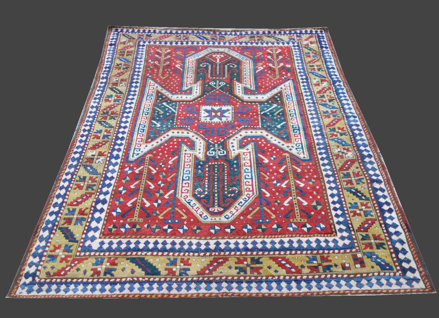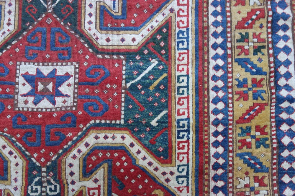Tappeto Kazak Sewan con un impostazione grafica che potrebbe essere definita "classica". Il manufatto dispone di una colorazione particolarmente bella e luminosa, con delle tonalitĂ di giallo e verde vivaci e di una proporzione ben bilanciata e maestosa. Antico tappeto da collezione.