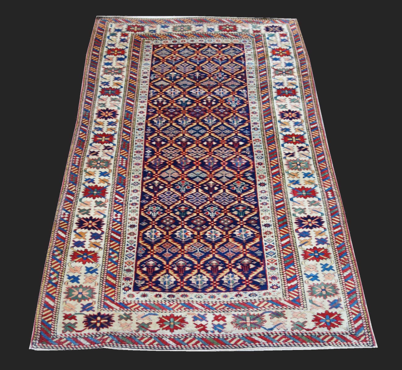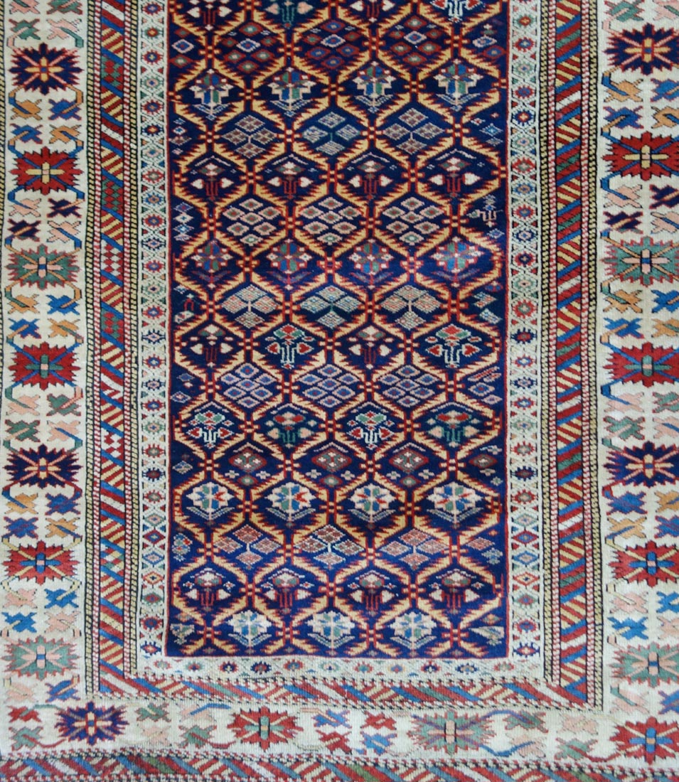 Tappeto Kuba a reticoli con una gamma di colori vivaci e brillanti. Una bella bordura a fondo bianco crea la cornice per questo tappeto antico.