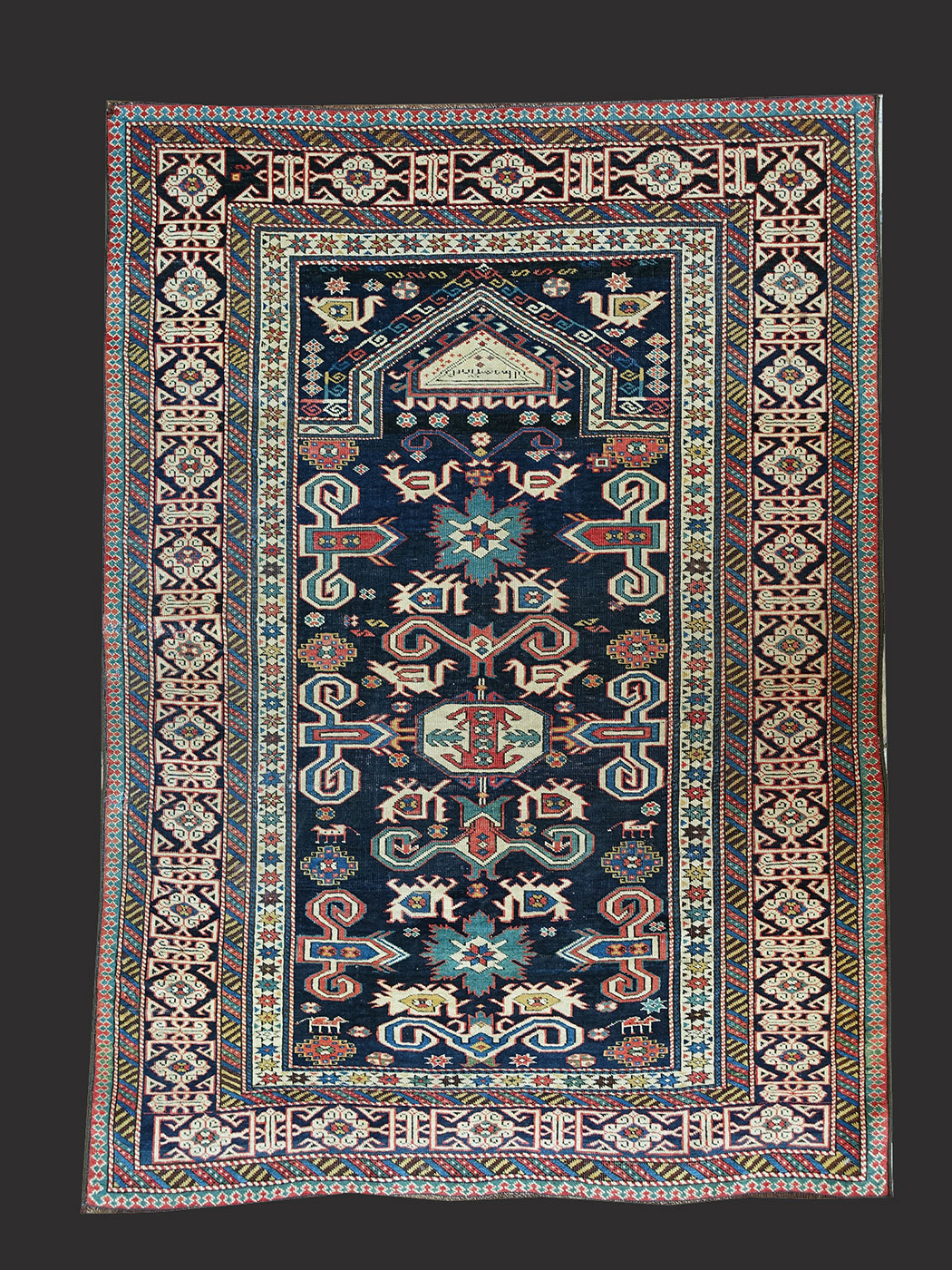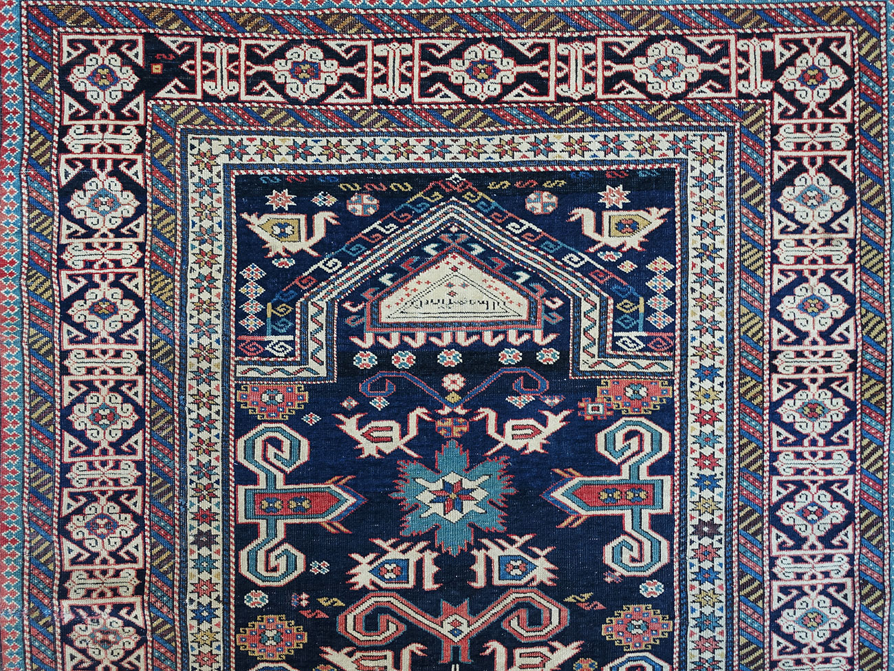 Questo tappeto da preghiera è un raro rappresentante nella vasta produzione di tappeti della provenienza Perepedil. I tappeti da preghiera Perepedil sono ricercati oggetti da collezione che spesso sfoggiano nella cuspide una cartuccia con iscrizioni. La gamma delle ornamentazioni segue il canone classico dei manufatti Perepedil incorniciato da una bordura cufica.