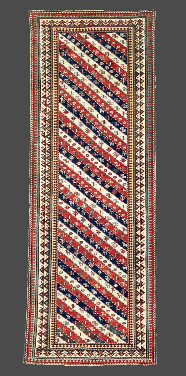 Tappeto Shirvan a fasce diagonali con un impostazione grafica molto accattivante. Il campo allungato è decorato con fasce diagonali in alternanza di colori. Tra i particolari interessanti: Piccoli animali stilizzati e la bella bordura a frecce reciproche.