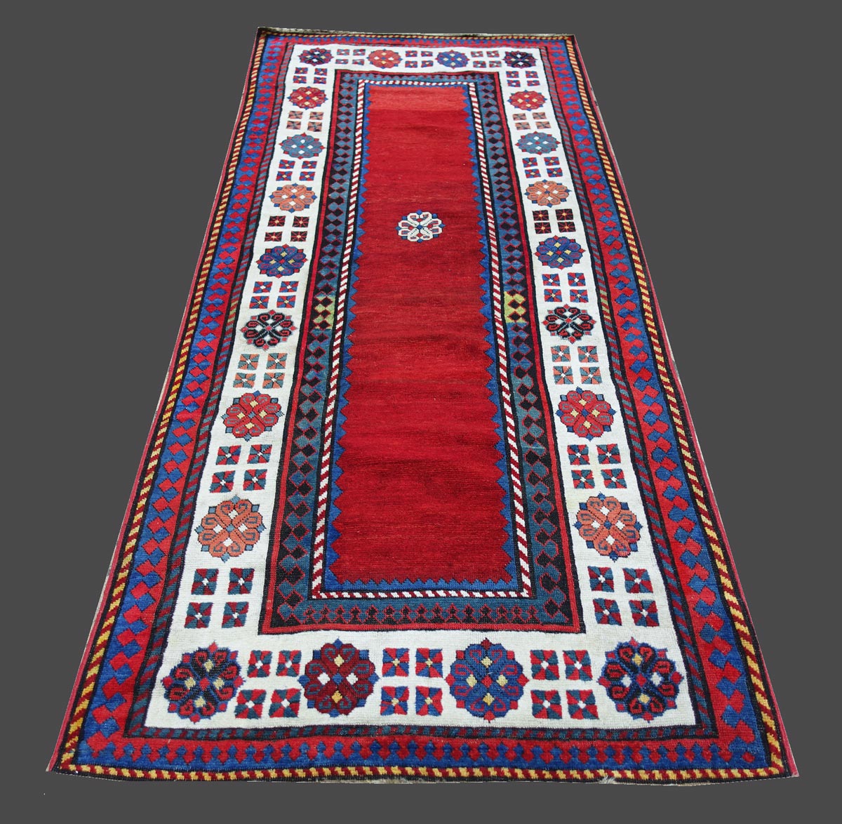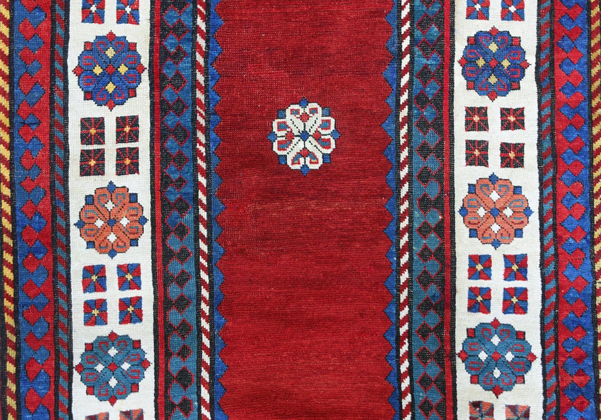 Il classico disegno Talish con il campo interno "met-haneh" (monocromo) si presenta a fondo rosso, un colore non molto comune per questa tipologia. L'unico disegno che decora il campo a tinta unita è una rosetta Talish, un motivo che caratterizza anche la cornice della bordura principale. Tappeto di espressione calma e di gusto contemporaneo.