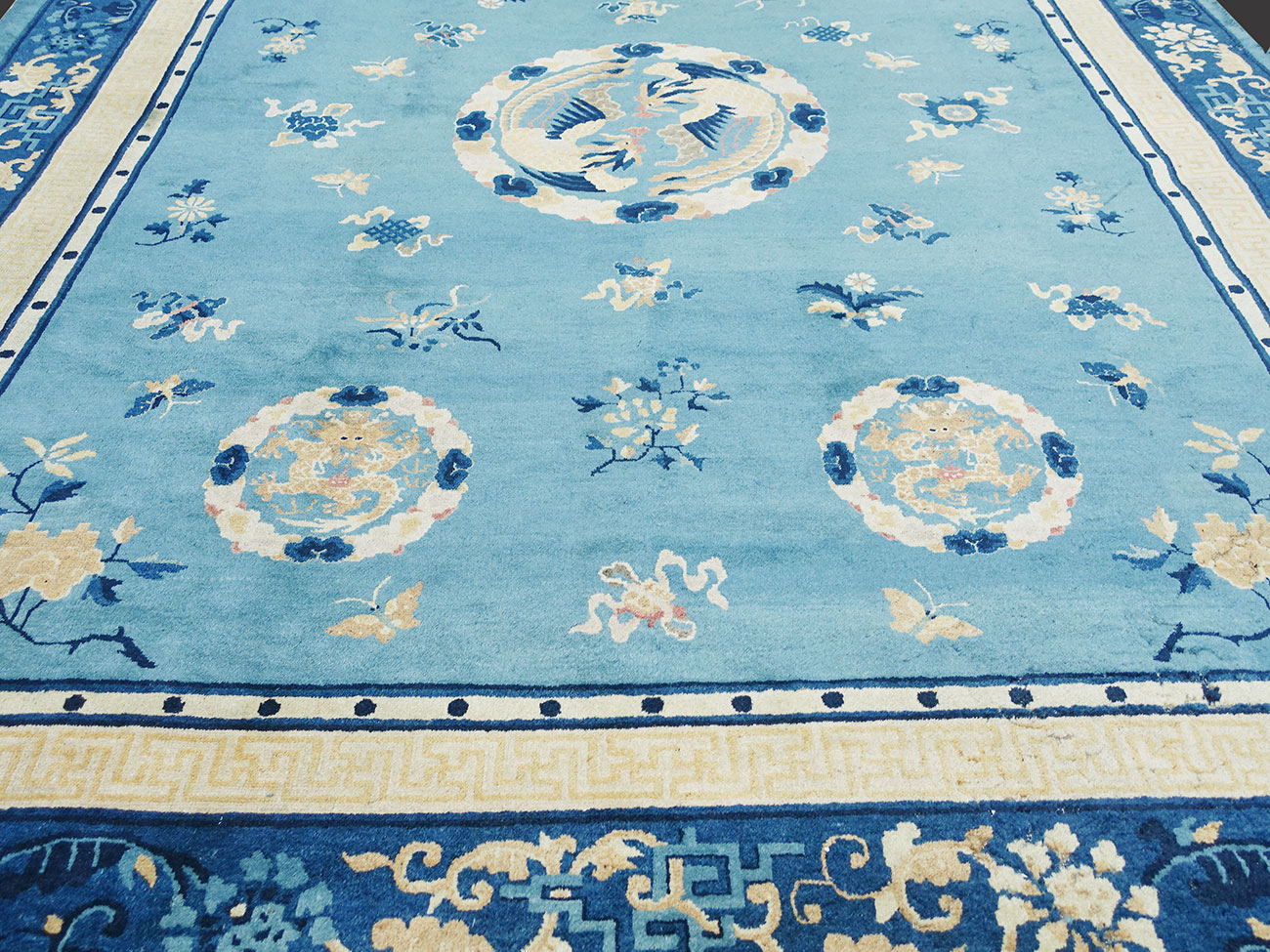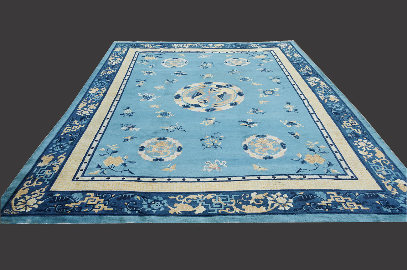 Tappeto Pechino con una colorazione molto attraente basata su tonalità di azzurro cielo. I centro è decorato con quattro medaglioni a draghi stilizzati che circondano un medaglione centrale che consiste da due fenici stilizzati ed intrecciati. In modo sparso alcuni elementi e motivi taoisti. Bordura azzurra con una greca geometrica e rami di peonie ondeggianti e stilizzati.