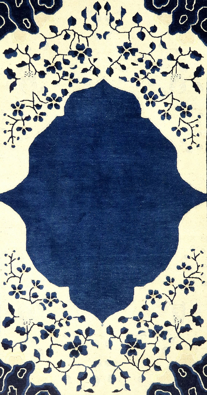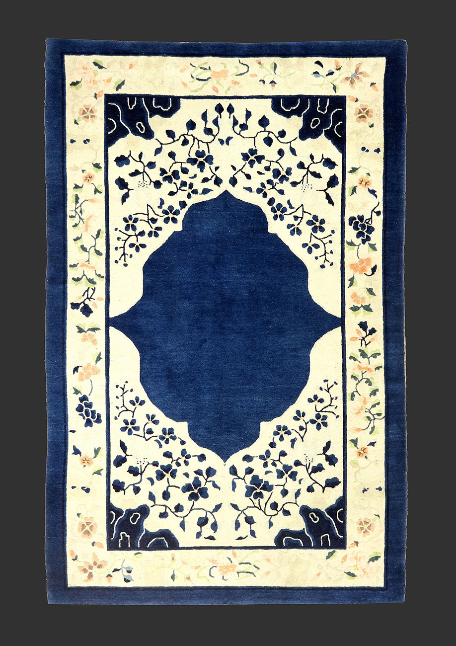 Tappeto cinese con un impianto di disegno assai inusuale. Il campo interno è influenzato dalla tradizione ornamentale islamica con un medaglione arabescato, contornato da rami fioriti. La bordura e gli angolari seguono la tradizione cinese. Manufatto di grande impatto grafico.