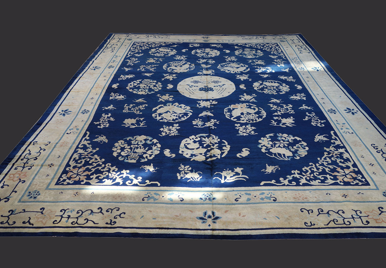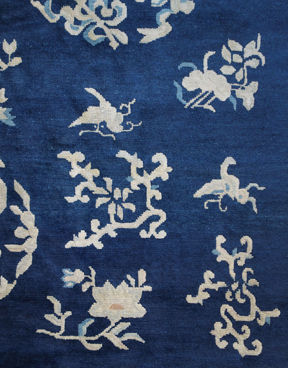 Tappeto Pechino a fondo blu inchiostro, decorato da un medaglione tondo chiaro circondato da e rami e fiori arabescati. Il contrasto tra le tonalitĂ di beige chiaro ed di blu scuro contribuisce all'eleganza del manufatto.