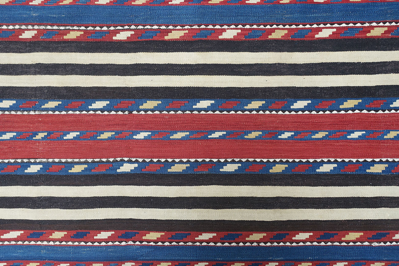 Kilim (tessuto piatto) di tessitura fine con un interessante disegno a righe. Fasce con tonalitĂ di blu, giallo, bianco e rosso alternano con fasce a beige e marrone. Piccole bordure in tessitura a zig-zag sono stati inseriti. Kilim di espressione molto moderno e contemporaneo con il fascino e la bellezza coloristica del manufatto antico.