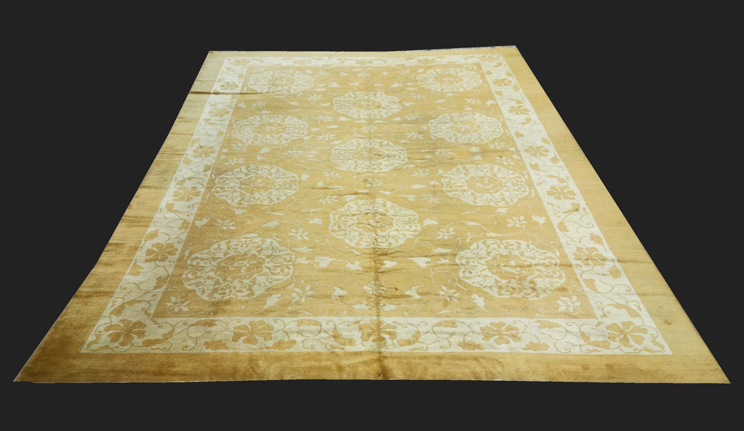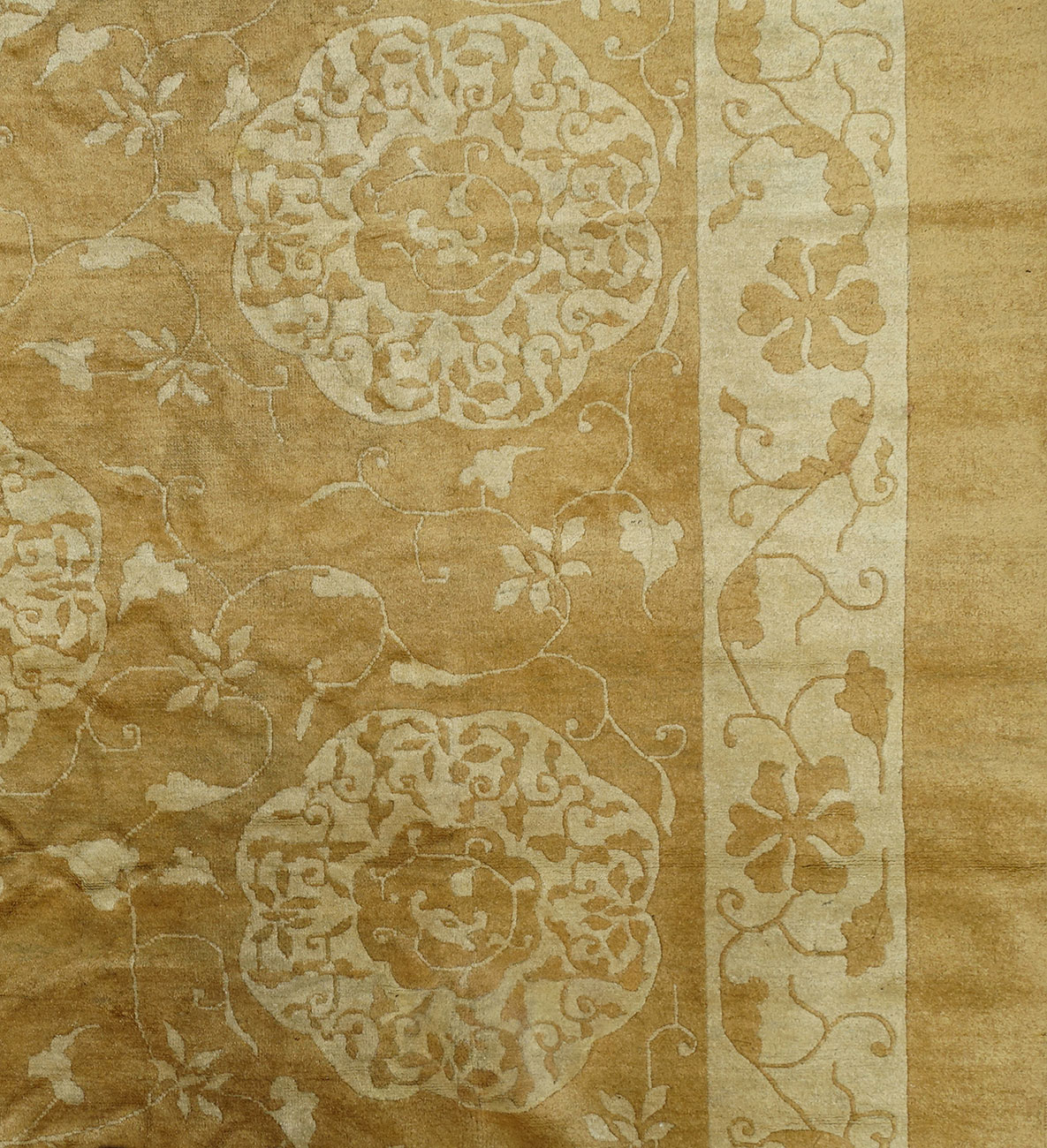 Tappeto Pechino che si presenta con un rarissimo fondo a color "oro". I disegni eleganti, composti da ricco racemo vegetale ed ornamenti floreali arabescati ricoprano il fondo in modo molto raffinato, facendosi notare da una colorazione "tono su tono".