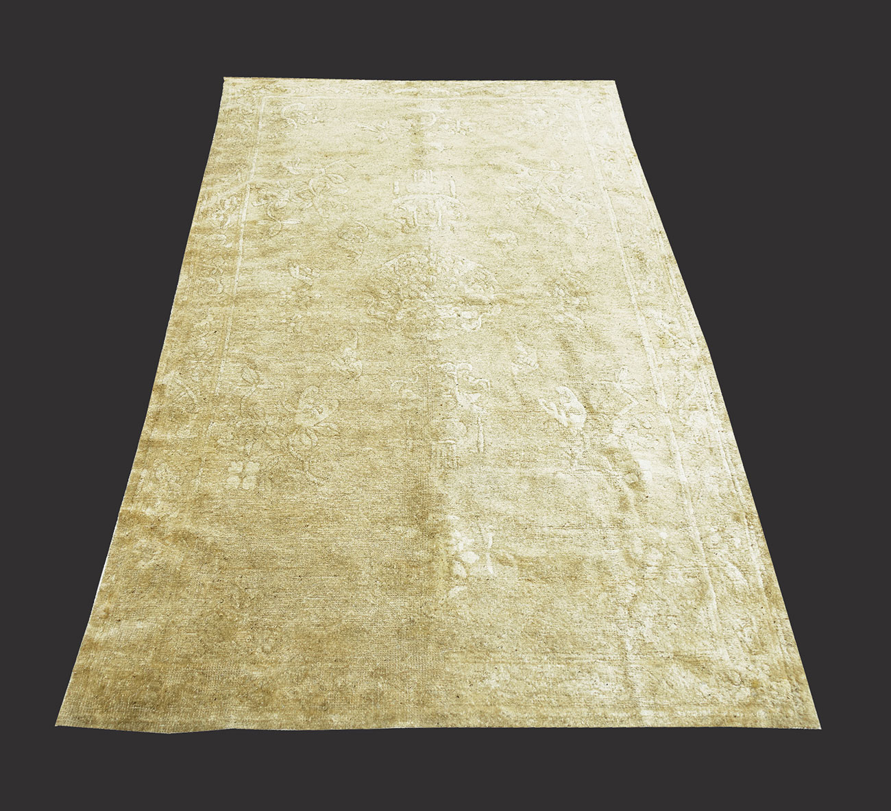 Tappeto Pechino di piccola dimensione con campo e bordo di color tinta unita monocromatica beige, con alcuni motivi floreali che s'intravvedono, eseguiti con un elegante intaglio in rilievo.