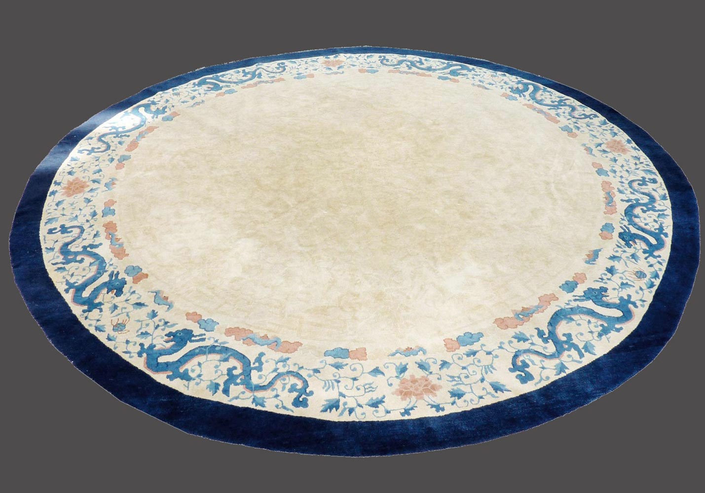 Tappeto Pechino rotondo con una decorazione a draghi stilizzati che si susseguono sulla bordura esterna del tappeto. Il campo interno è monocromo con un accenno di decorazioni a rami intrecciati "tono su tono".