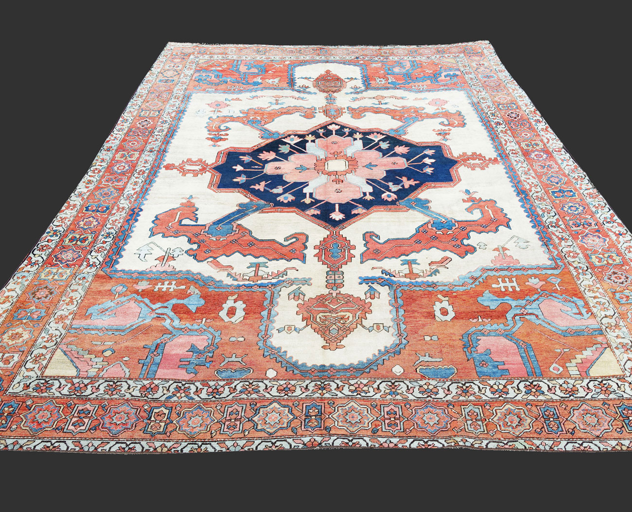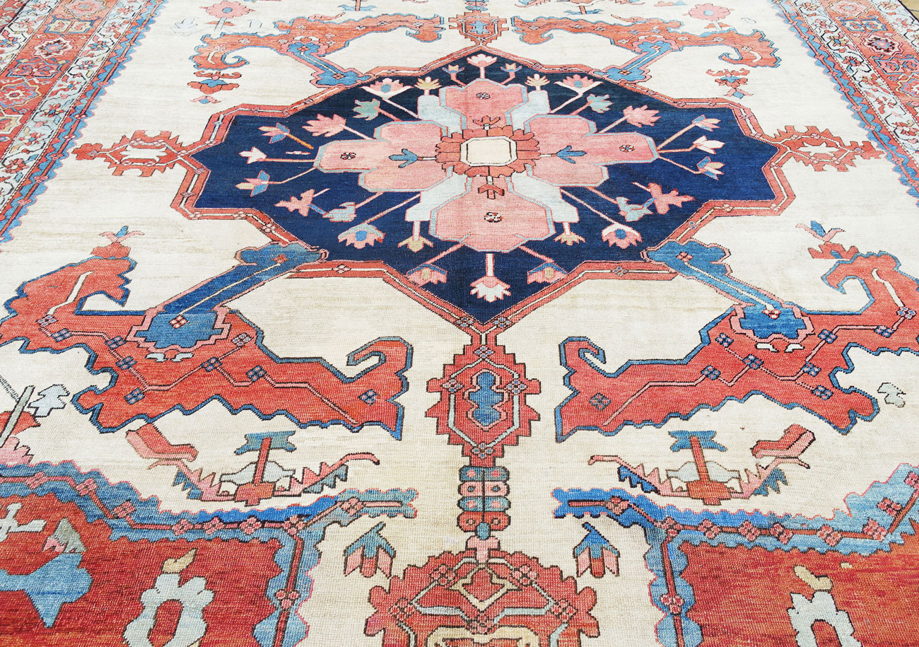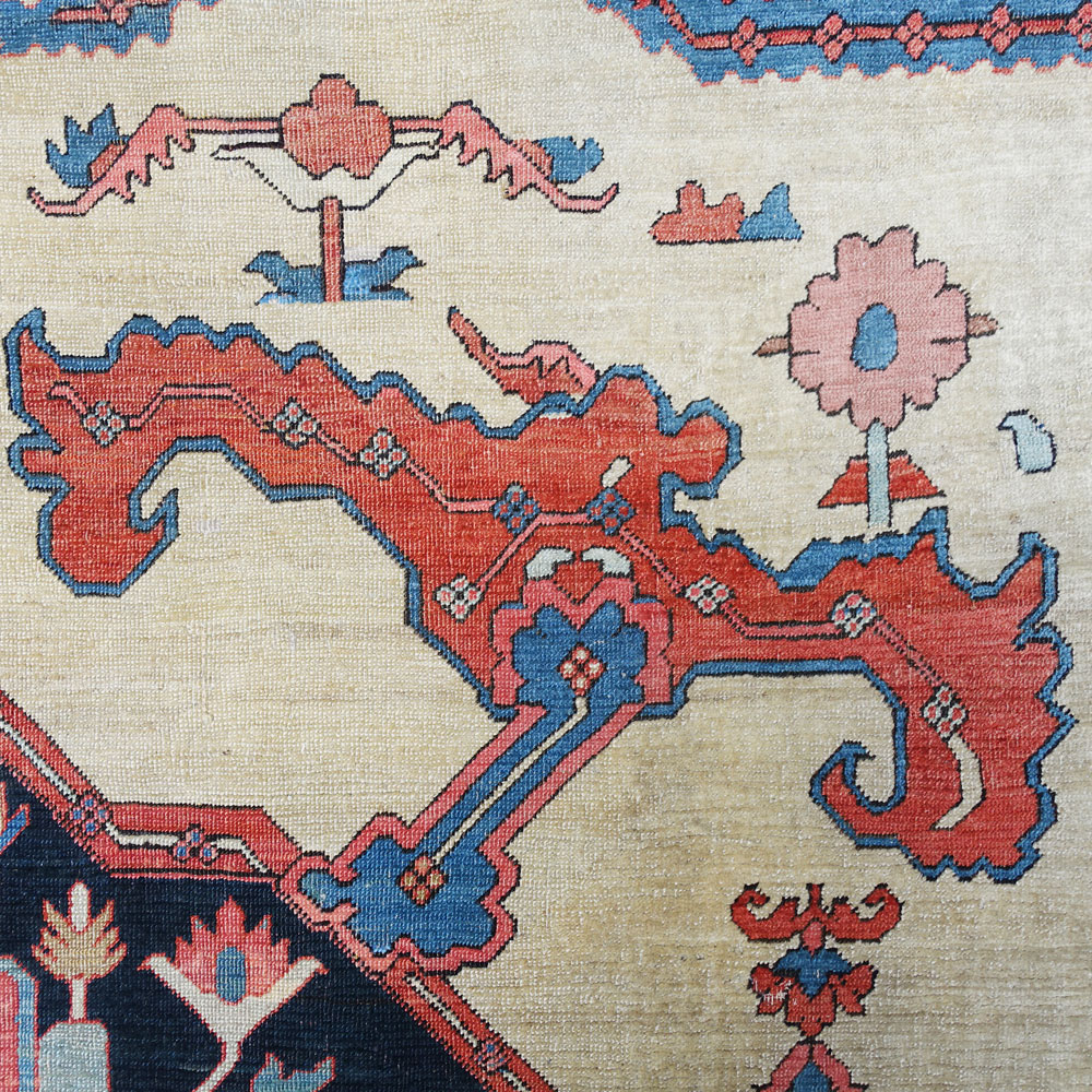 Tappeto Serapy di grande fascino ornamentale. I disegni ricordano i tappeti Bakhshaesh della stessa zona, di cui alcuni vantano ornamentazioni spettacolari con "nuvole stilizzate" monumentali che compongono decori di espressione grintosa ed espressiva.