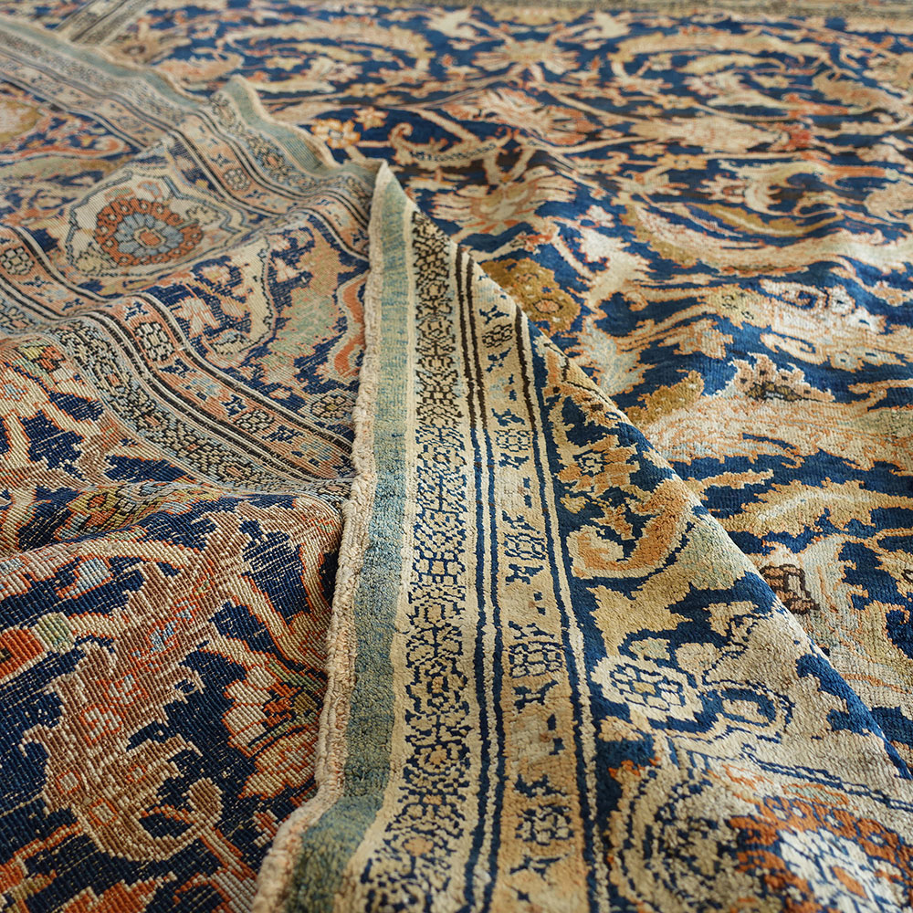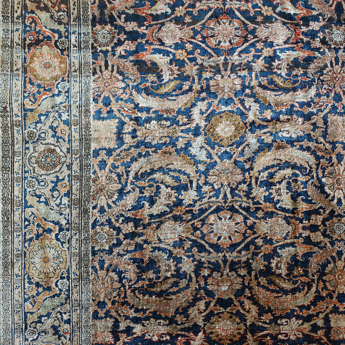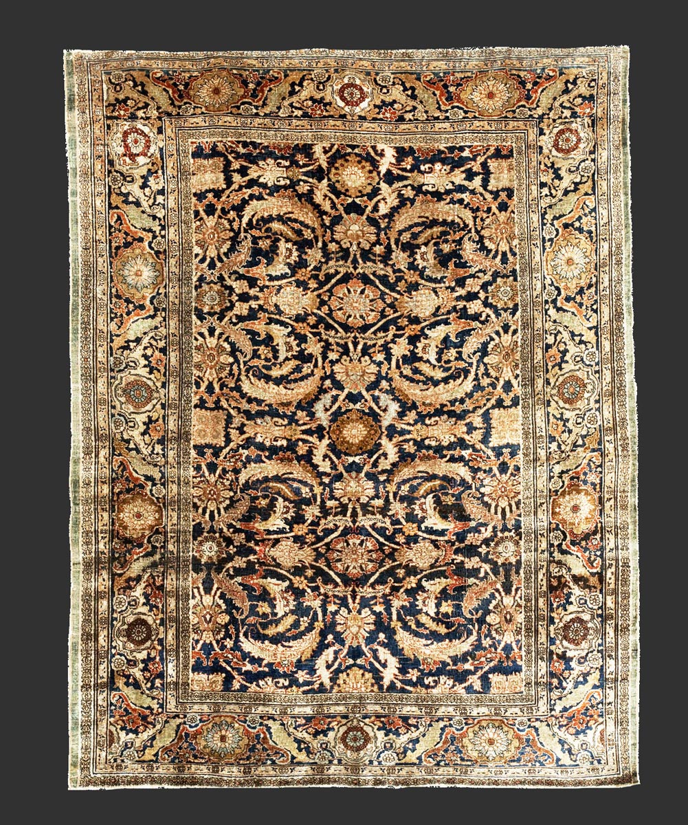 Antico tappeto Heriz in seta con un disegno ad andamento infinito. Il motivo "Herati" si presenta in modo particolarmente ben disegnato che mette in risalto delle foglie curvate e delle palmette stilizzate.