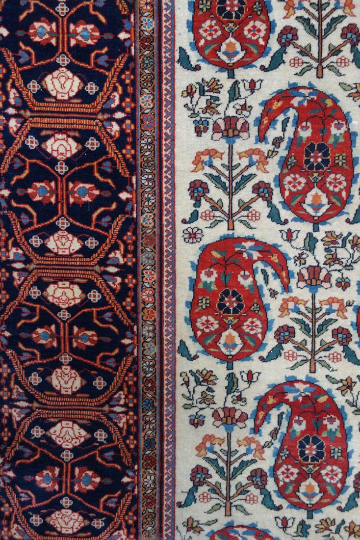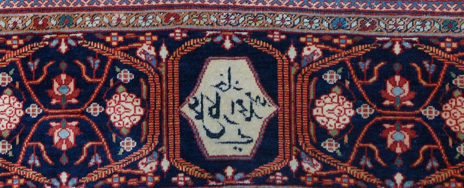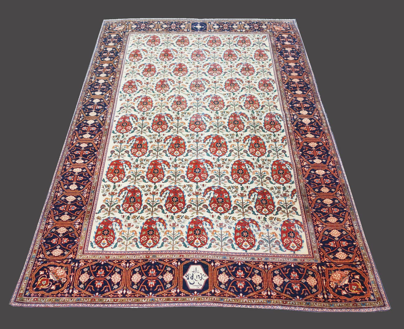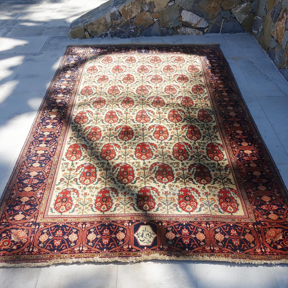 Tappeto Kashan "Mohtasham" caratterizzato da un ornamentazione a "Boteh", ad andamento infinito, circondato da una bordura a fondo blu notte con un impianto grafico particolarmente interessante. Tipico per la manifattura del maestro "Mohtasham" sono le lane "Kork", a tatto morbidissime.
