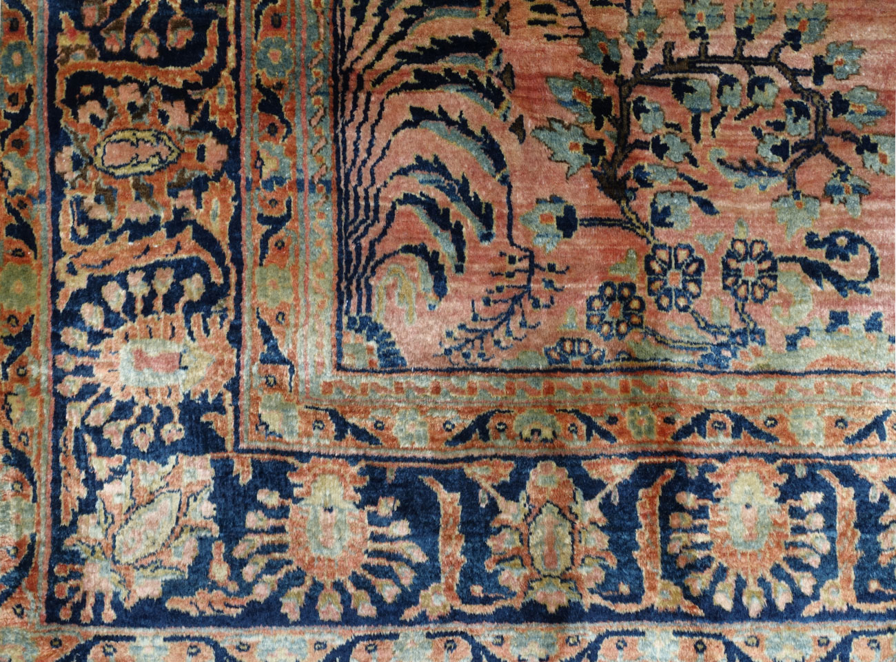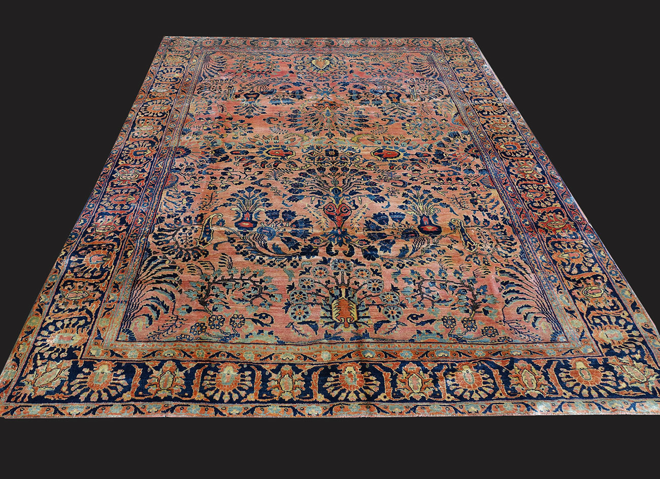 Persia occidentale 1920 circa Tappeto Sarouk con un fondo di color salmone tenue ed ornamentazione a base di arabesche e rami floreali e vegetali. Lane lucenti.