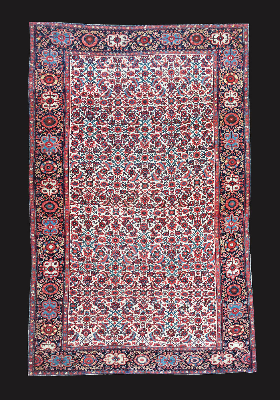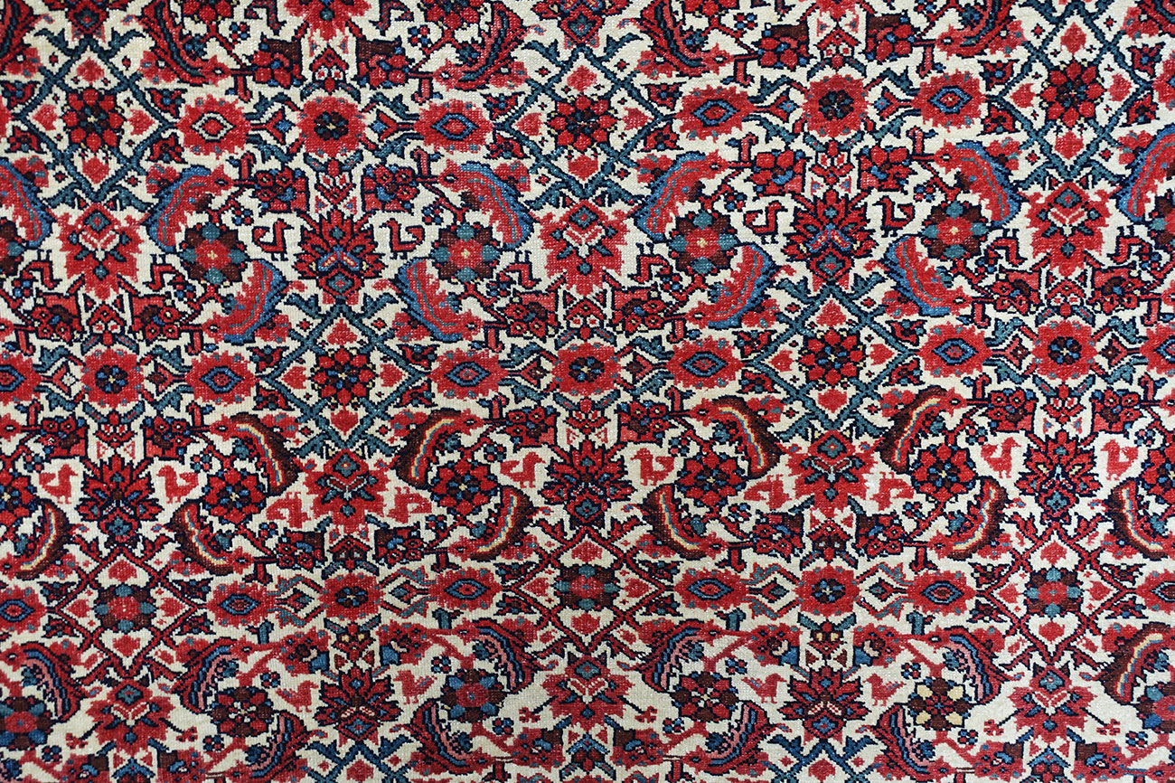 Il campo interno a fondo bianco è interamente ricoperto dal disegno "Herati" e viene contrastato da una bordura a fondo blu con ornamentazioni a cartigli e rosette. Particolari attraenti sono piccole raffigurazioni di uccelli stilizzati. Tappeto di espressione elegante, finemente annodato.