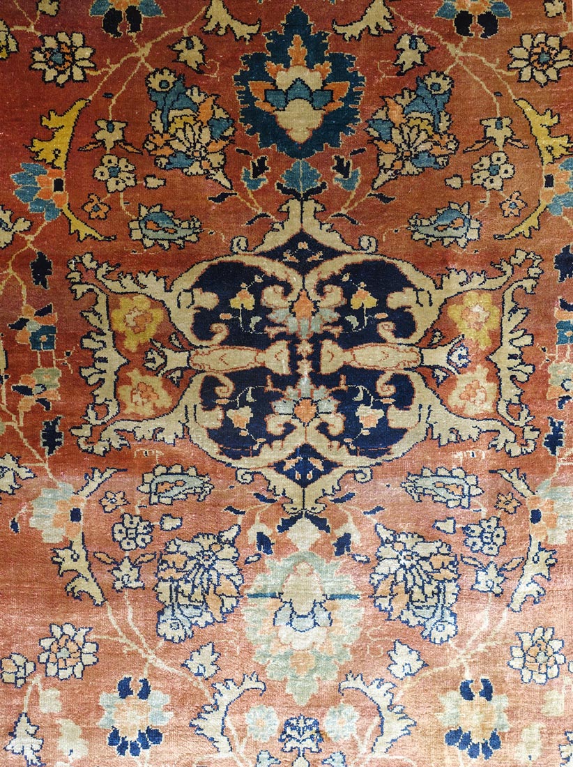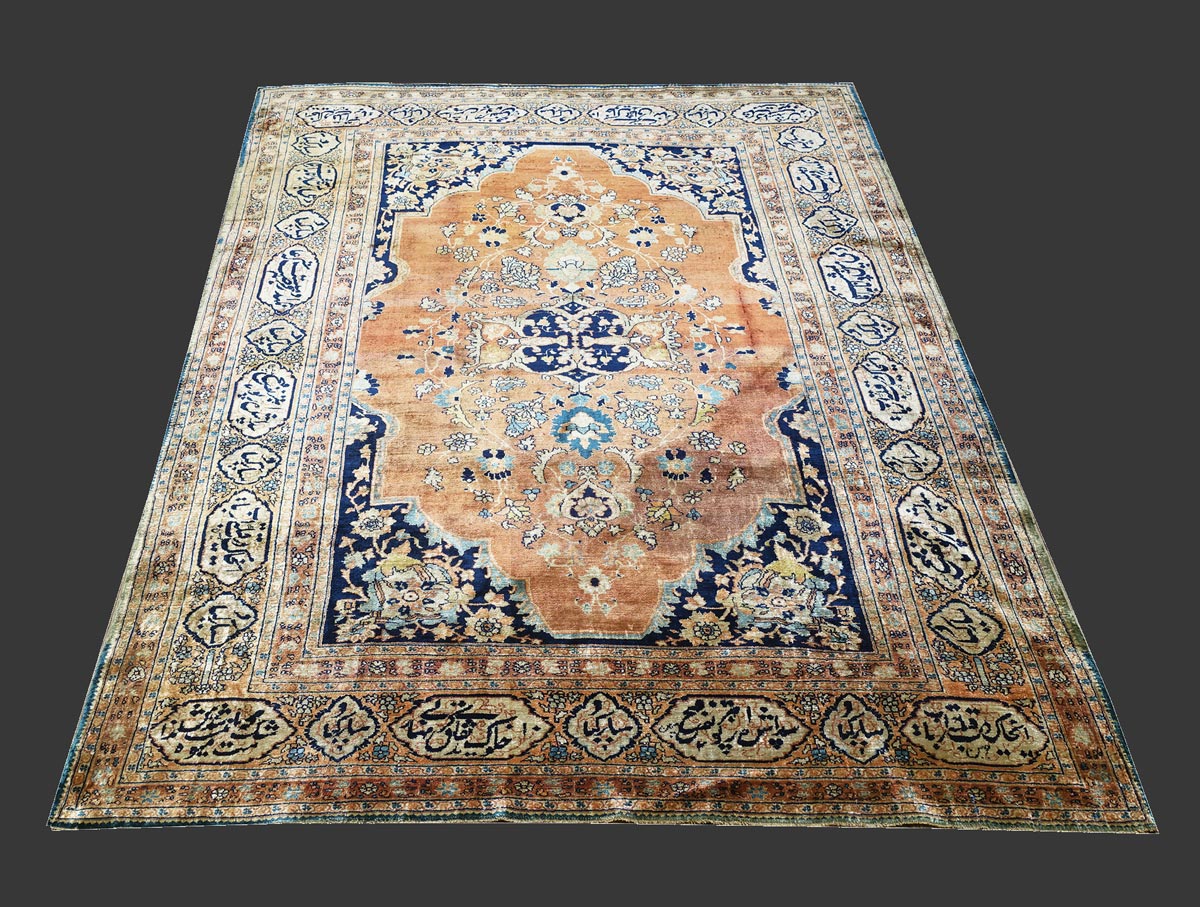 Elegante tappeto del'atelier del maestro Hadji Jalili con annodatura in seta pregiata. Il campo interno, decorato con fiori e rami arabescati, è circondato da una bordure a medaglioni con inserzione di scritte in calligrafia araba. Si tratta di versi di poesia. Antico tappeto da collezione.
