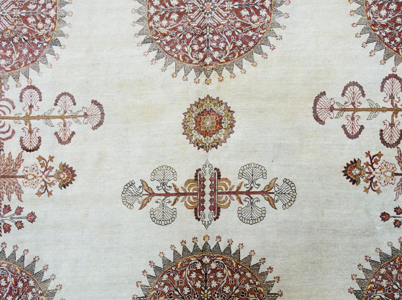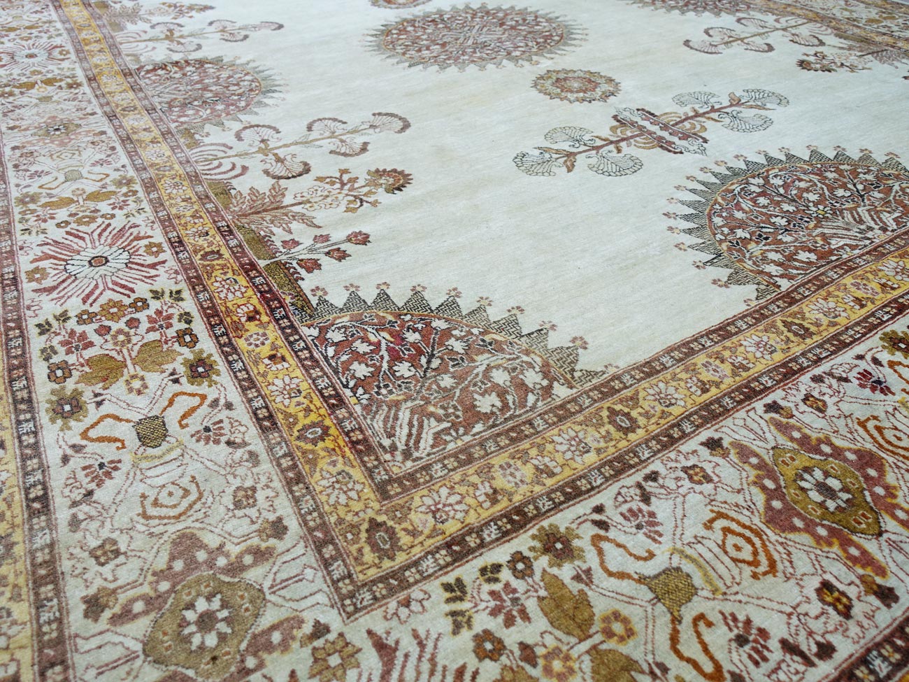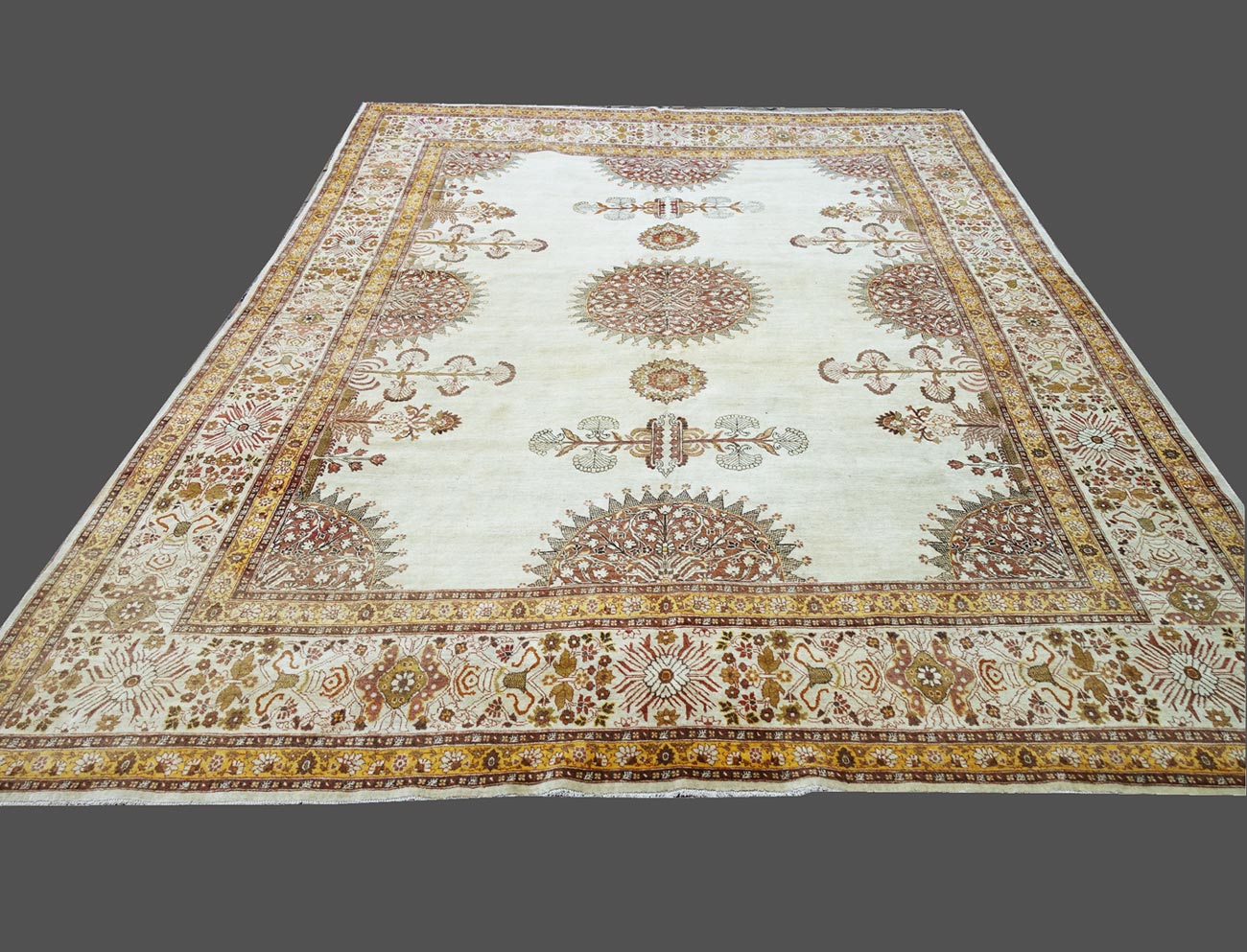 Tappeto Tabriz caratterizzato da una gamma di colori molto armoniosi con un ornamentazione ad ampi spazi a fondo avorio. Elegante tappeto con medaglioni a forma tondo, circondati da raggi ed alcuni elementi arabescati molto decorativi.