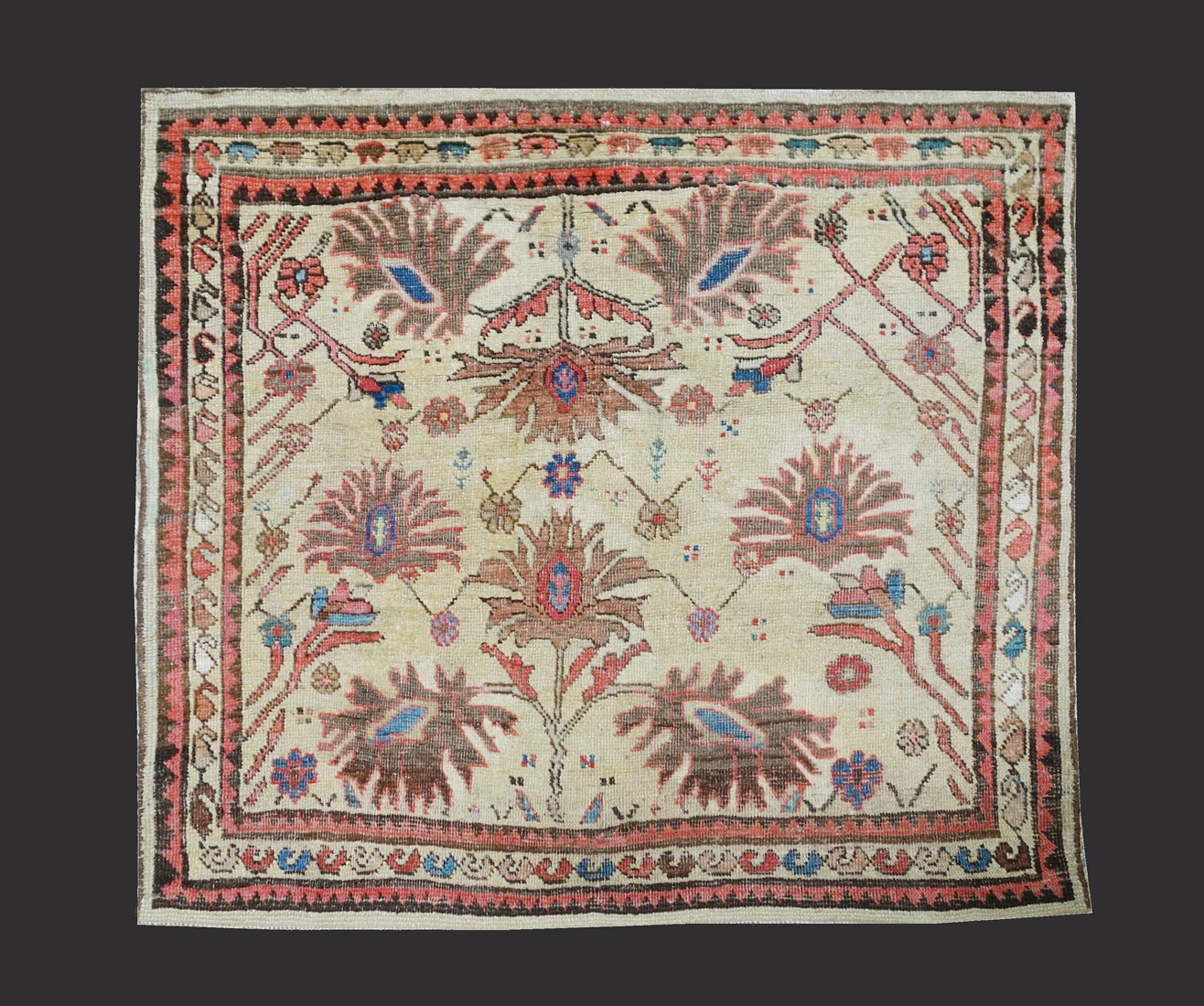 Tappeto Bidjar di dimensione particolarmente piccola, quasi quadrata, con un disegno di espressione molto tribale, basato su palmette e rami stilizzati. Oggetto da collezione.